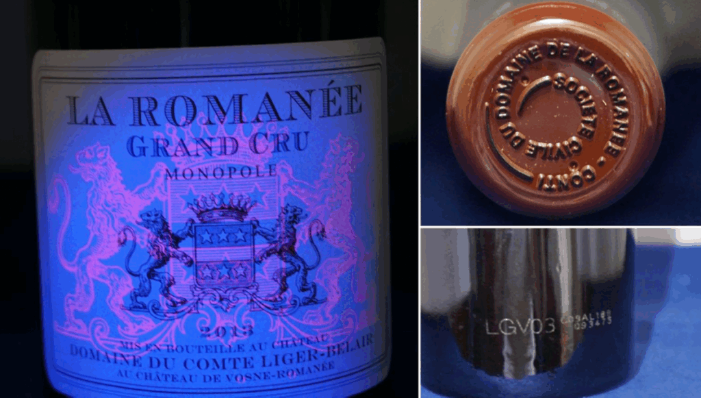 - The label: Look for uneven fonts, smudged print, or off-center crests. A magnifying glass can reveal flaws invisible to the naked eye. UV light can reveal new materials that did not exist at the time of bottling or repairs to the label or bottle that have been done to restore or fake a vintage. Some winemakers will inscribe invisible markings only visible with blacklight.